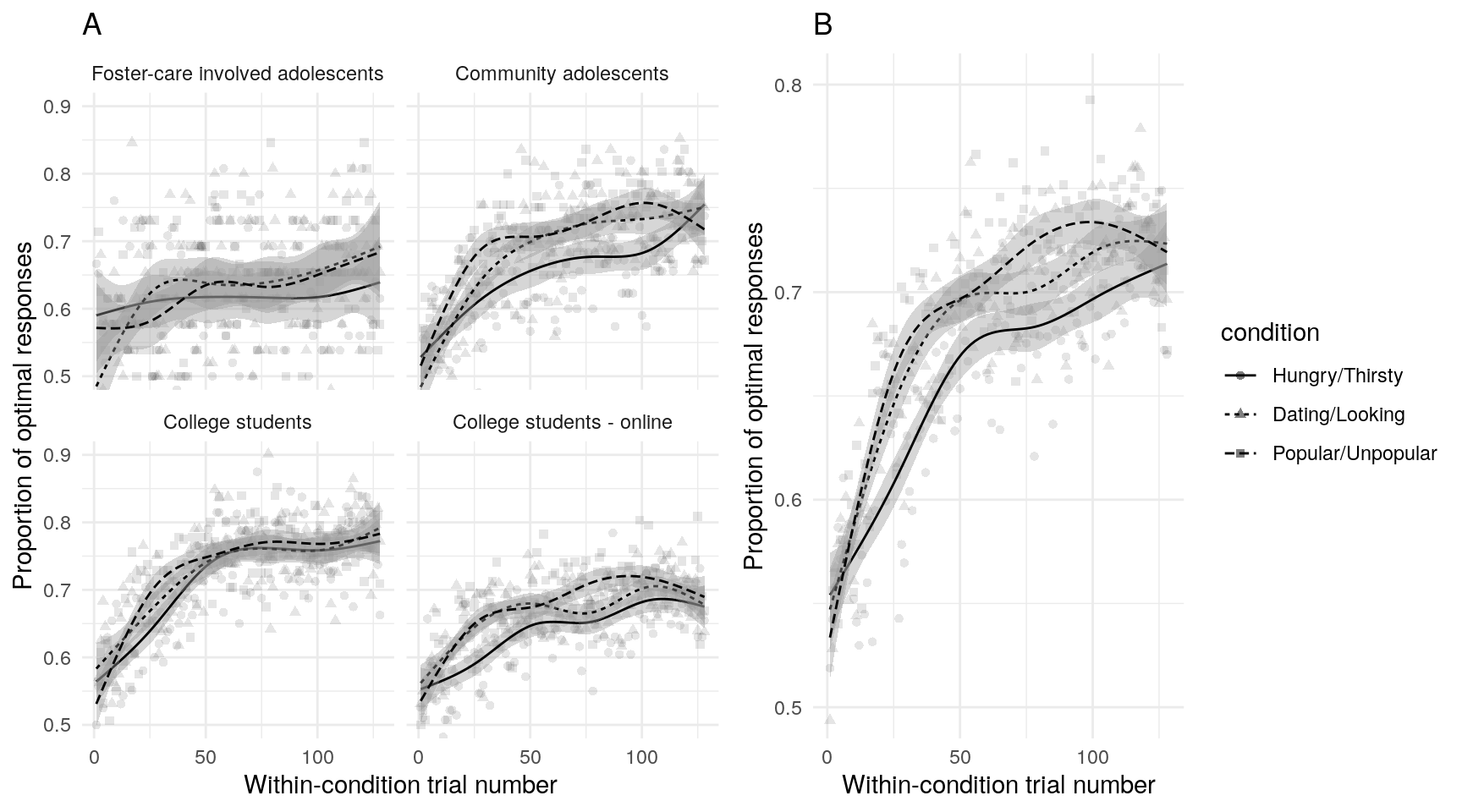 Examination of the raw data using scatterplots and non-parametric best-fit lines can help insure that data conform to expectations, and that subsequent model estimates accurately reflect the data. On average, participants in all samples and all conditions demonstrated learning (Figure @ref(fig:trialaverages)A, although note that given the small sample size, the foster-care involved sample shows more variability across trials). There is also some indication that learning occurs more quickly in the two social motive conditions (Figure @ref(fig:trialaverages)B).