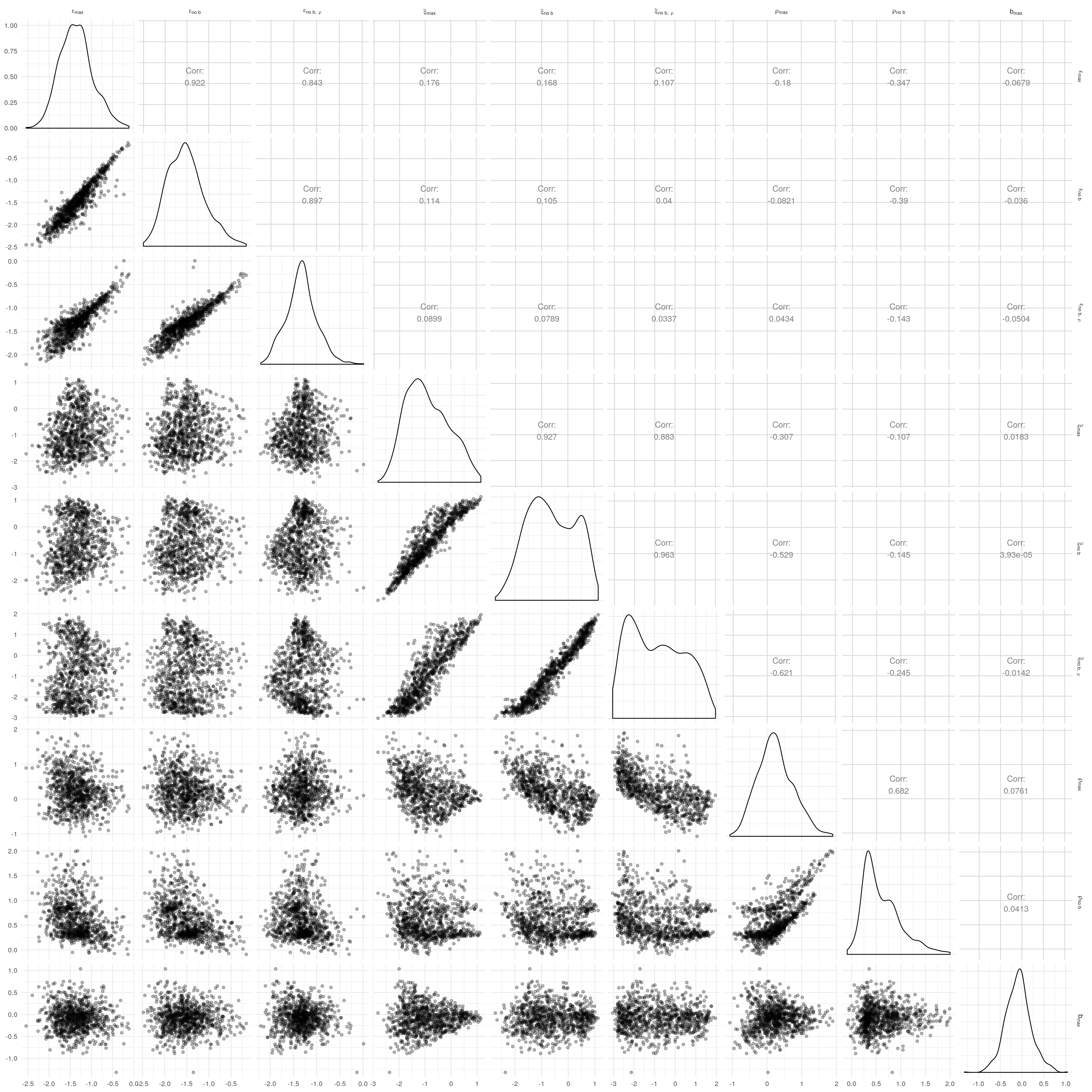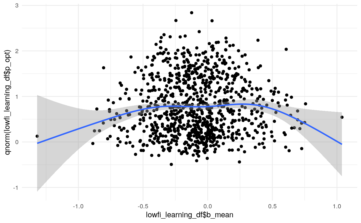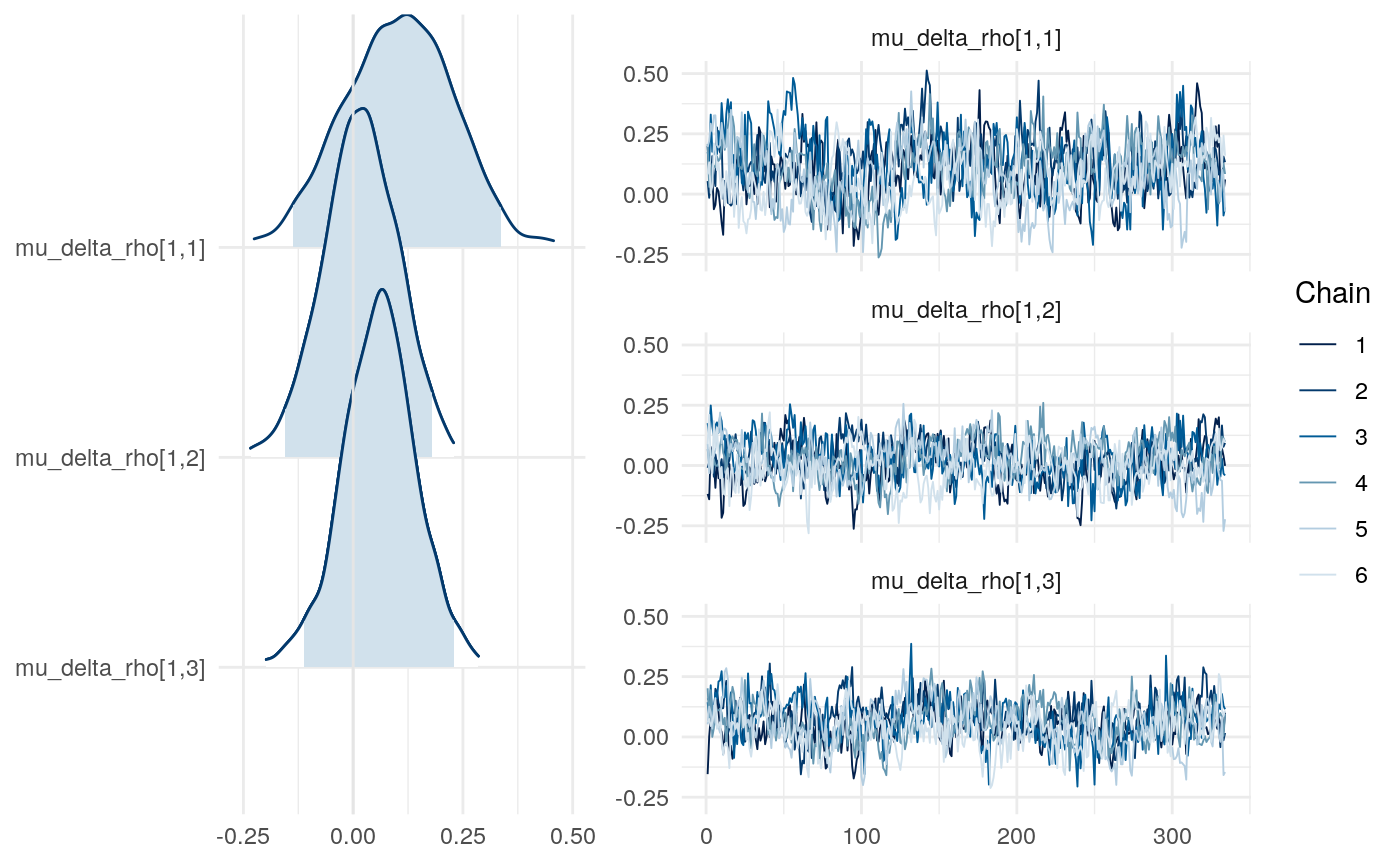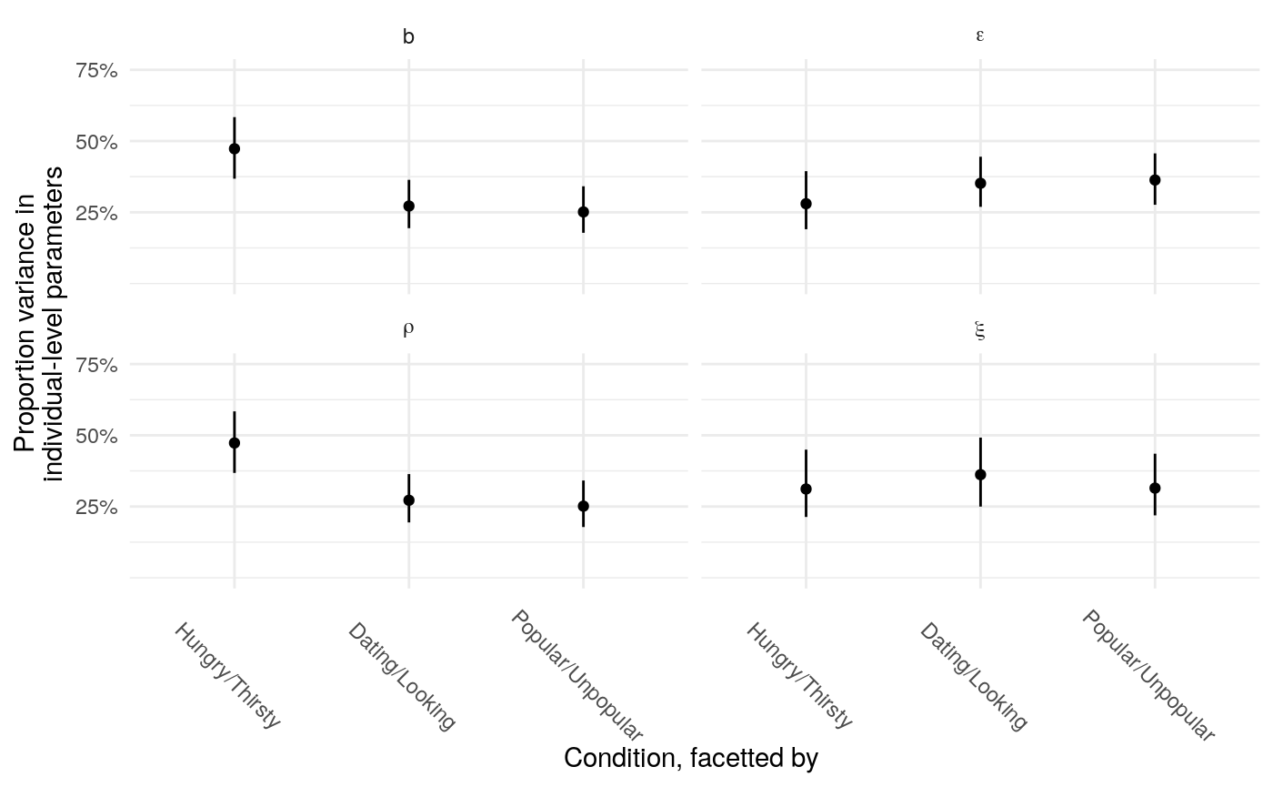 So the proportion of variance due to the means of individual-level parameter posteriors tends to be highest for \(\xi\) and lowest for \(\rho\).
