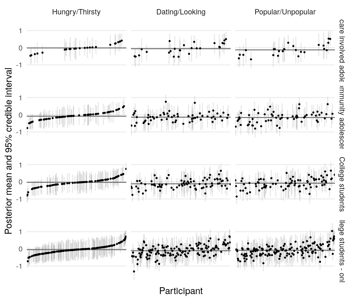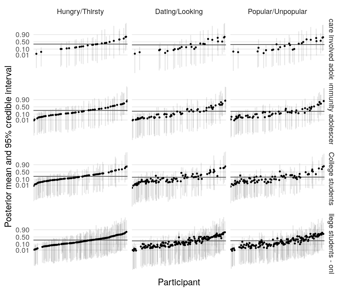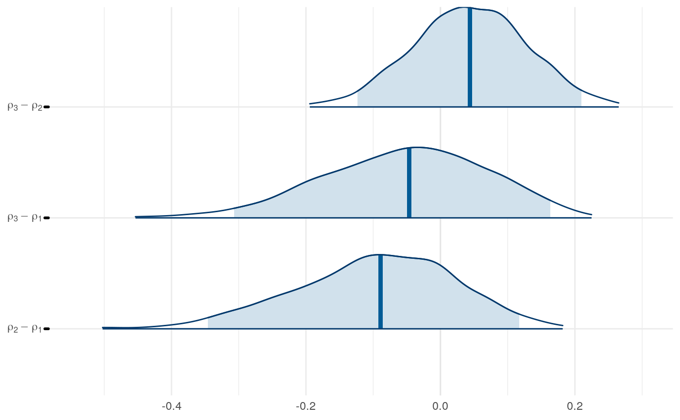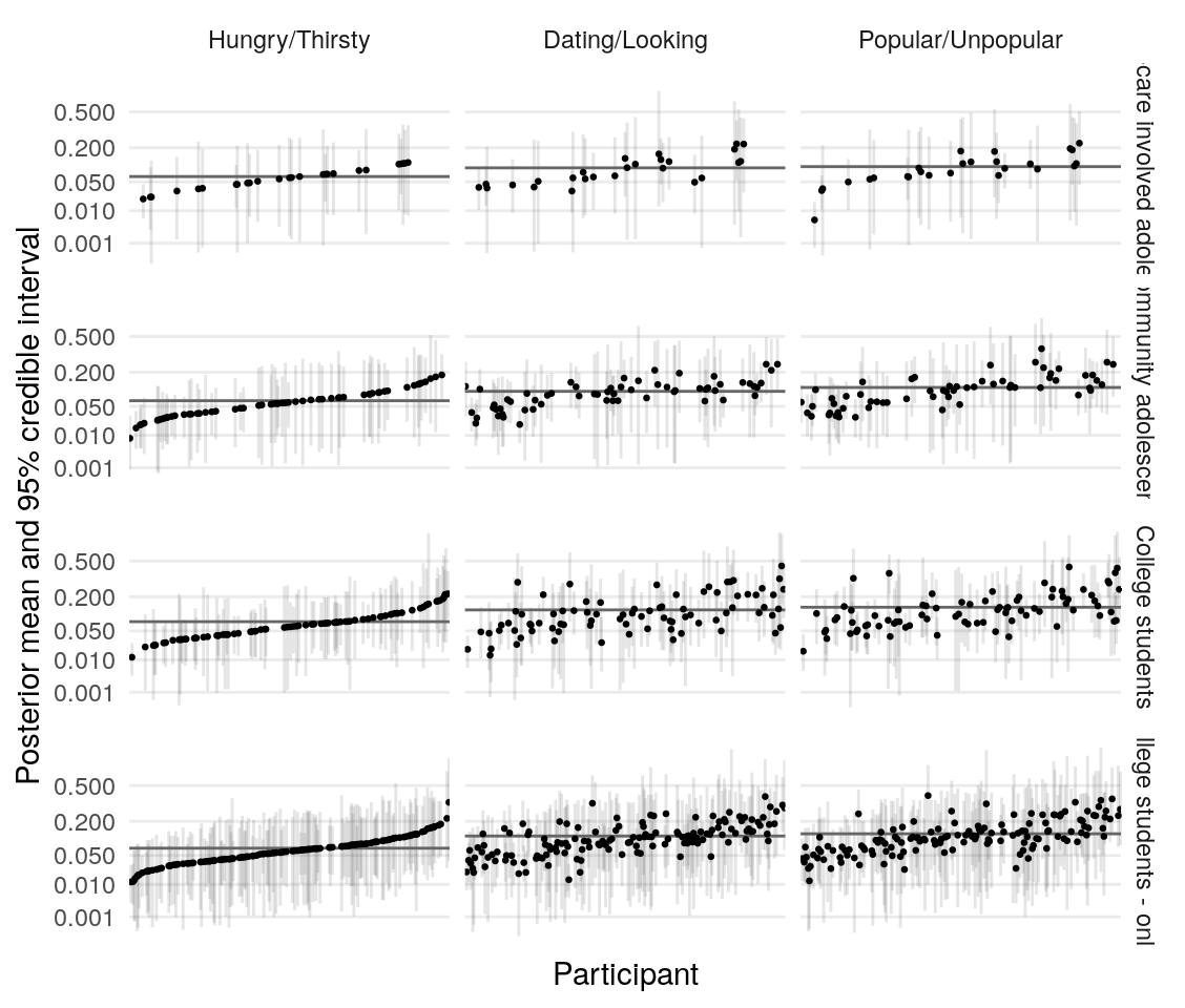 So the proportion of variance due to the means of individual-level parameter posteriors tends to be highest for \(\xi\) and lowest for \(\rho\).