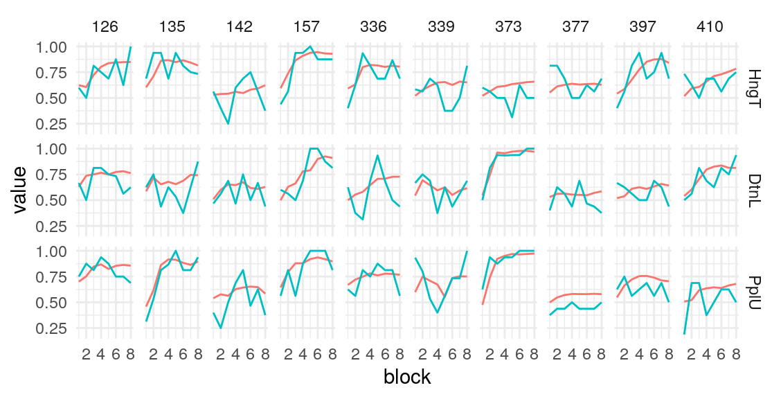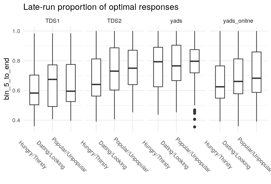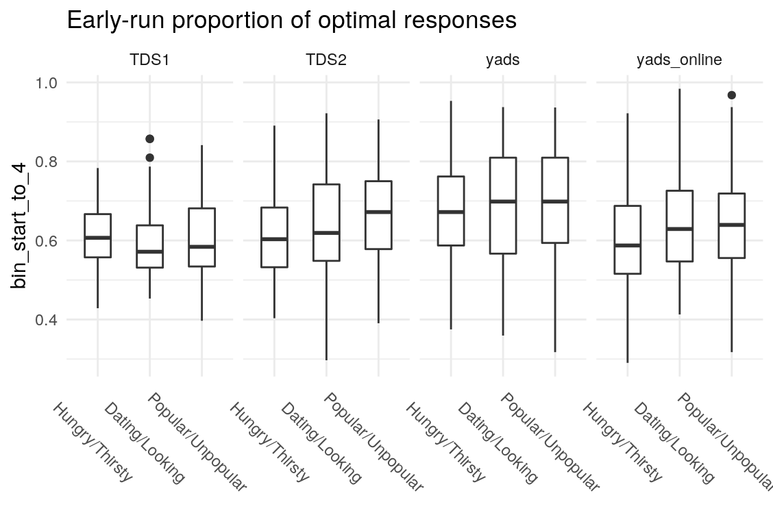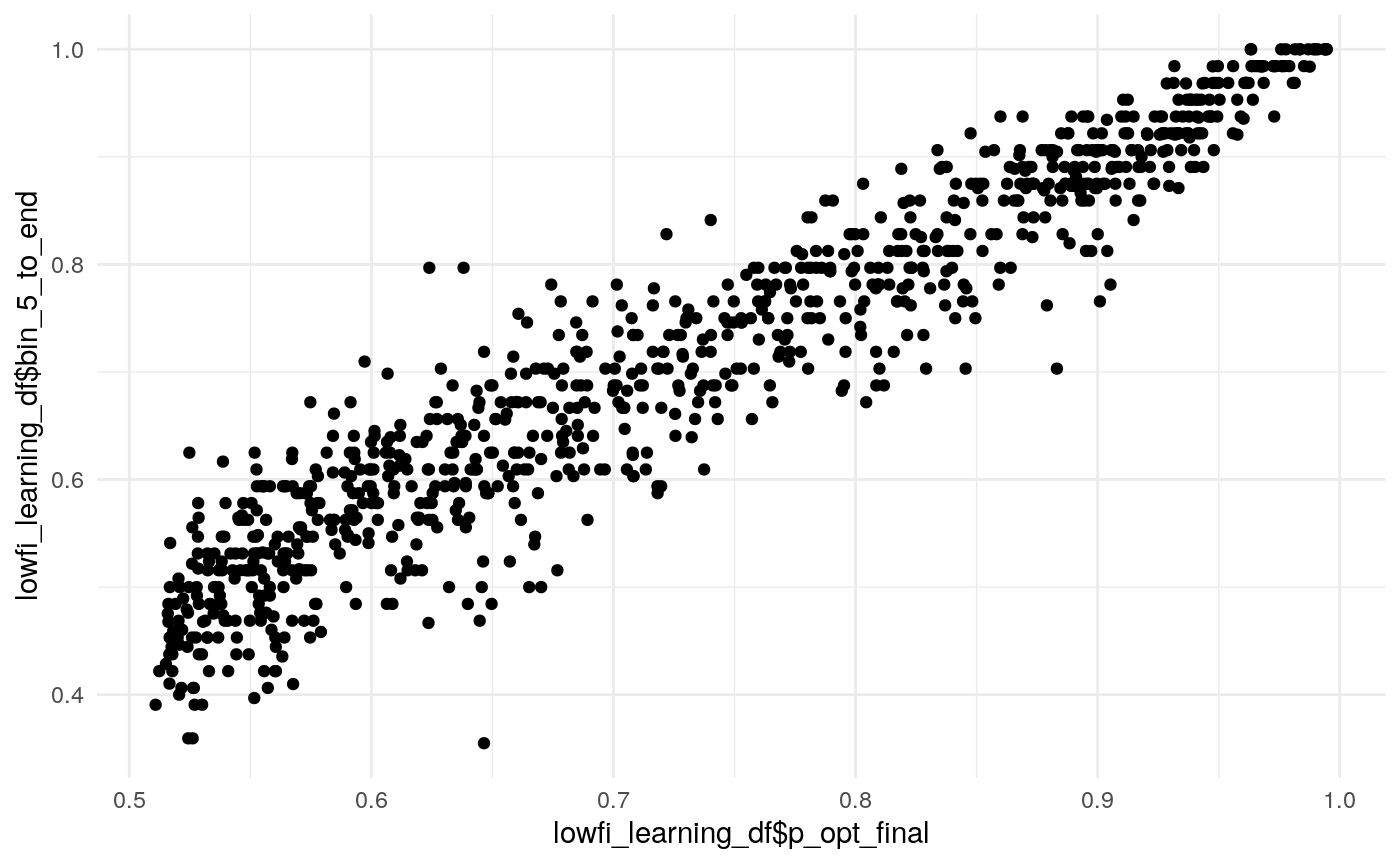 Examining the above plots where corelations r > .90 are colored red (and r = .9 color black), it appears that the most wide ranging correlations are from bins that combine information during the latter half of the run in various ways. If one had to choose such a summary in these data, the average number of optimal presses from bin 5 through 8 (from trial 65 through trial 128) seems like a good candidate. It is highly correlated with average optimal responding from bin 6-end and 7-end, combined bins 5 & 6, combined bins 6 & 7, as well as the combined bins from start to finish (“bin_start_to_8”). Using the intercept from a logistic regression with the trial number predictor centered toward the end of the trial also captures a good deal of variance that corresponds to optimal responding on trials toward the end of the run.