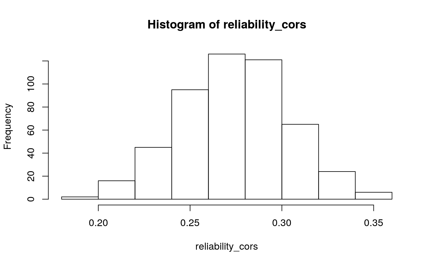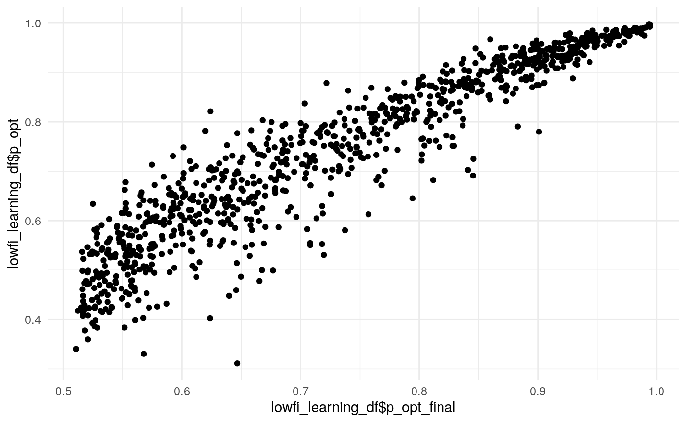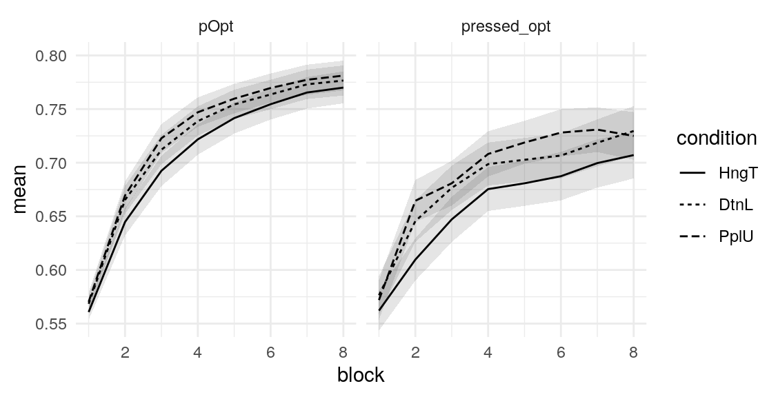 Given these model parameters, and the very strong assumption that nothing would purturb them from session to session, what would be the expected test-retest correlation for the differences between the H/T baseline and D/L or P/U conditions? The outcome of interest I’ll use is the average difference in the probability of choosing the optimal label in the last half of the run. This will over-estimate the true test-reliability because we’re using what is in practice an unknown latent parameter. Measurement error in any real situation will attenuate this true reliability. One way to assess this reliability is to draw random IDs (which in this case corresponds to simulated runs through the task), and then correlate the mean number of optimal presses in each condition across two sets of random draws. After all, since these simulations are all generating using the model parameters from the same participant, the rank-order of the mean probability of optimal press across the three conditions should be similar across simulations to the extent that the generated behavior is stable. A less ad hoc approach may be to use an interclass-correlation estimate to partition the variance into that systematically related to condition versus residual variance. In both cases, the estimate is middling, around .4 and .5 respectively. We can compare this to the observed reliability of the parameter estimates we obtain from the Bayesian models.