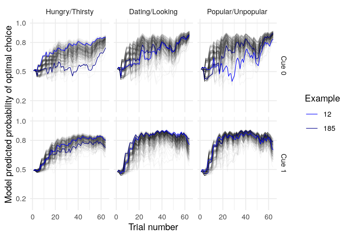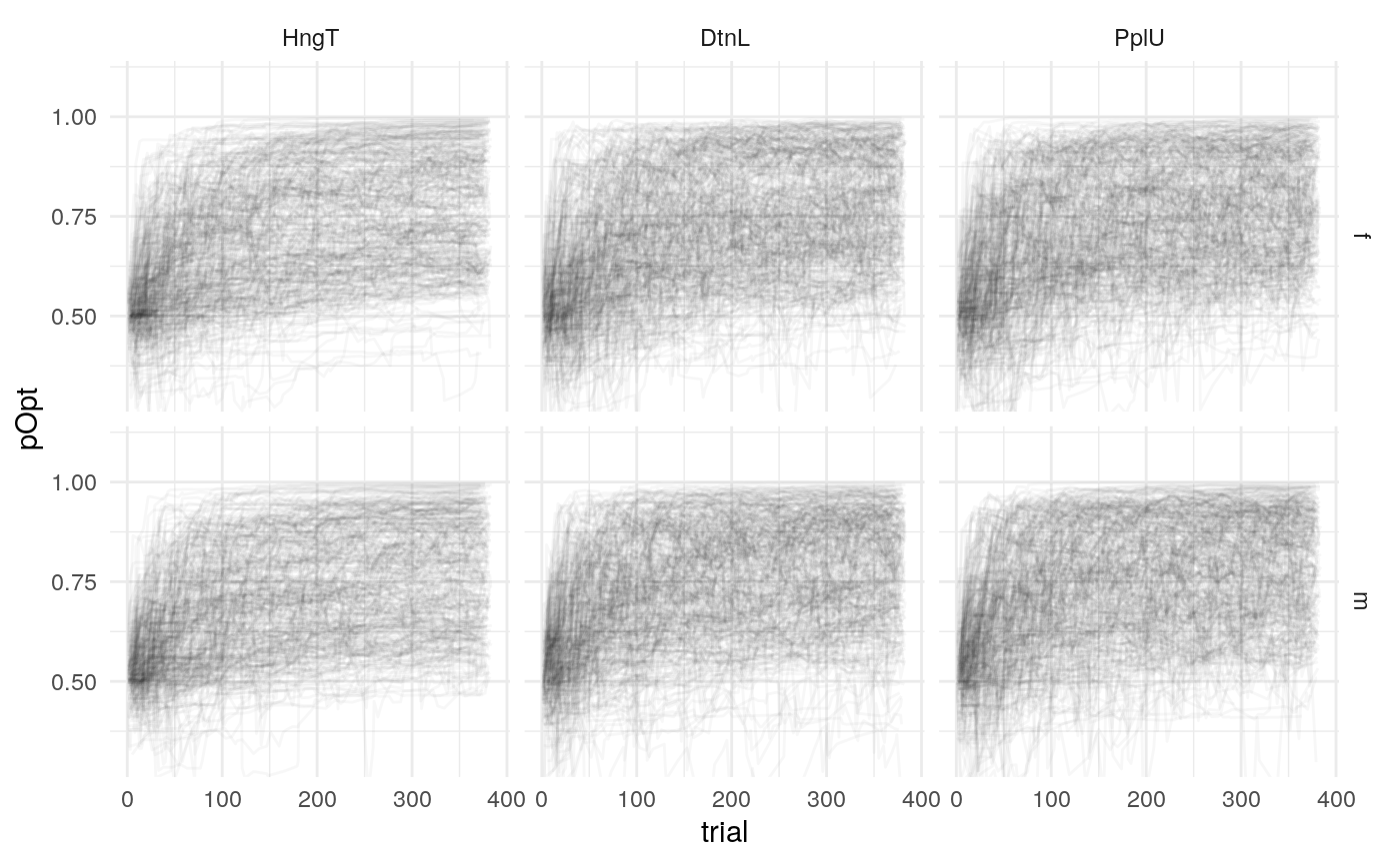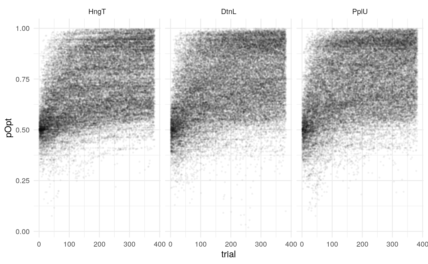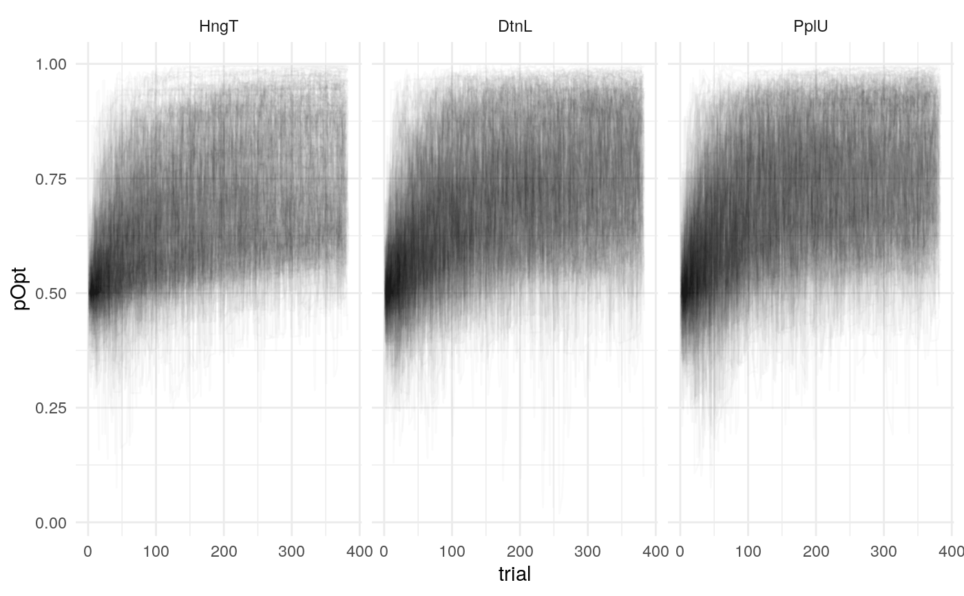 Below is a plot of 313 model predicted runs, all using the exact same task structure (arbitrarily, the first run of the task). Behavior is guided by the mean parameter estimates, so any variabilility in behavior is due to the probabilistic nature of selecting either the right or left option based on the model’s current knowledge at some point during the task. Another way of framing this is that it is the behavior of the averge actor, in 313 identical, hypothetical runs.