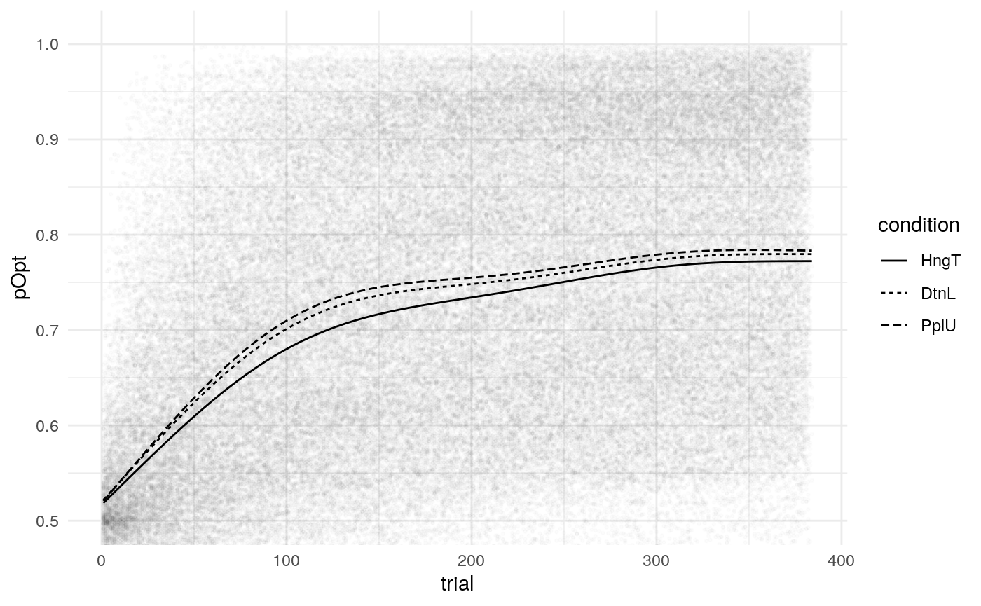 (ref:trialaverages) Average number of optimal responses for each trial across all participants. Best fit lines are generalized additive models with 95% confidence intervals.