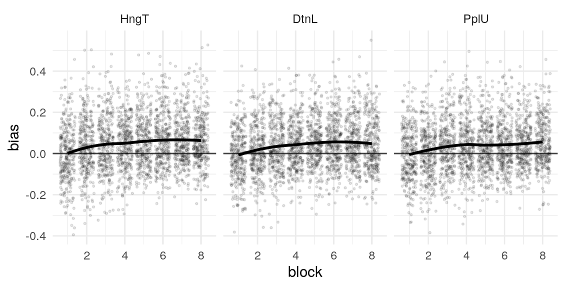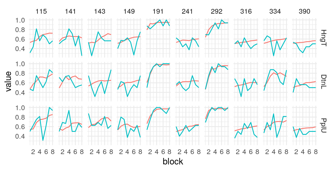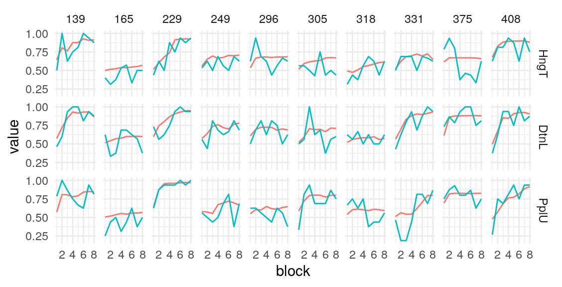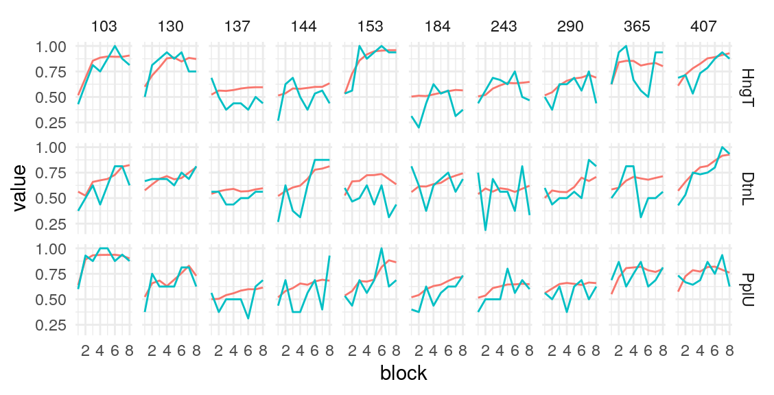 fit-model-to-participant-data.RmdUsing the model presented in the section on testing simulated data, I estimate the posterior distribution of the model parameters given the data provided by four groups of participants. Quality of estimation can be supported by (A), (B), (C), (D).