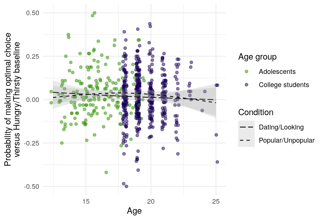 | Optimal choices \(\sim\) Age | Adolescent | 0.11 | 0.08 | 1.37 |
