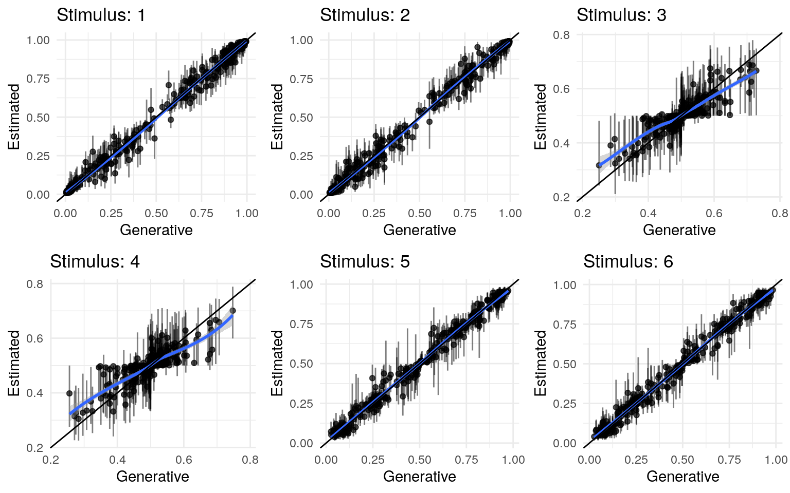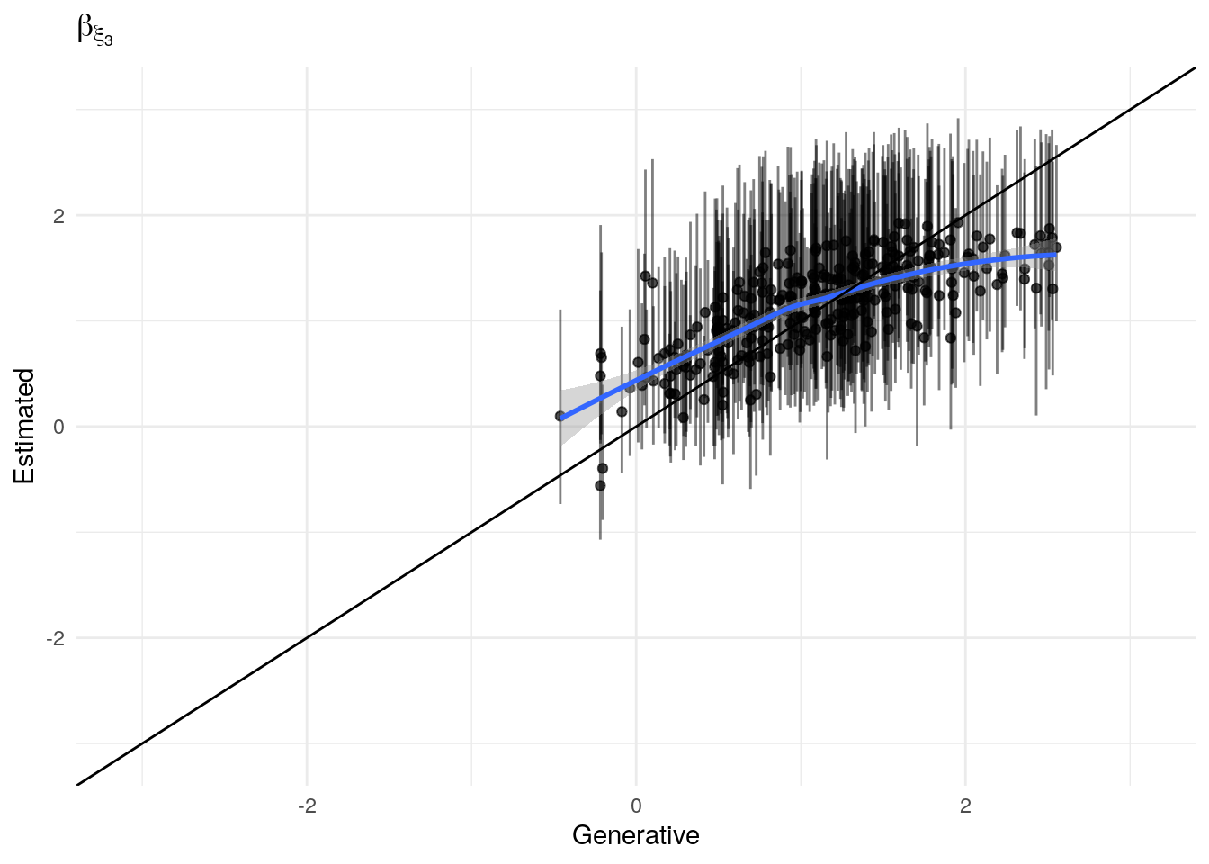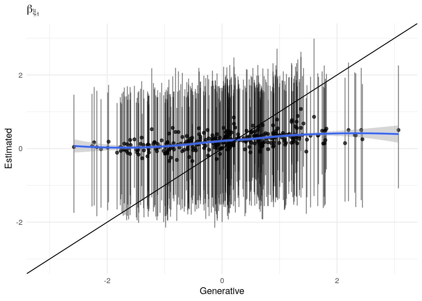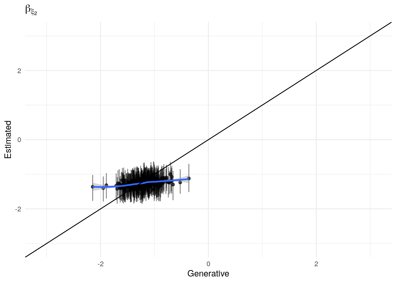 The model as described above was fit to simulated data using RStan (version 2.19.3; Stan Development Team, 2018), sampling from 4 chains with 1000 warmup iterations and 500 sampling iterations per chain. The posterior means for each parameter are compared to those that generated the simulated task behavior. The plots below allow visual comparison of the fitted model posteriors for each parameter to the data-generating population means, as well as to the means of the data-generating parameters for each sample, and for each individual. It is clear from these plots that the parameter estimates from this particular run capture the generating parameters, with two exceptions. First, the estimate of the population mean of the irrudicble noise parameter, \(\xi\), for one condition did not capture the generating parameter. This may be because this parameter was intentionally set very low so that \(\xi^\prime \approx 0\). The second instance occurs with the bias parameter for one condition. This may be acceptable because the parameters of interest safely capture the generating values, and this single condition bias parameter is not very far from the identity line. Additionally, it should be noted that the fitted model does capture the mean of generating \(\delta_b\) and \(\beta_b\) parameters for all conditions.