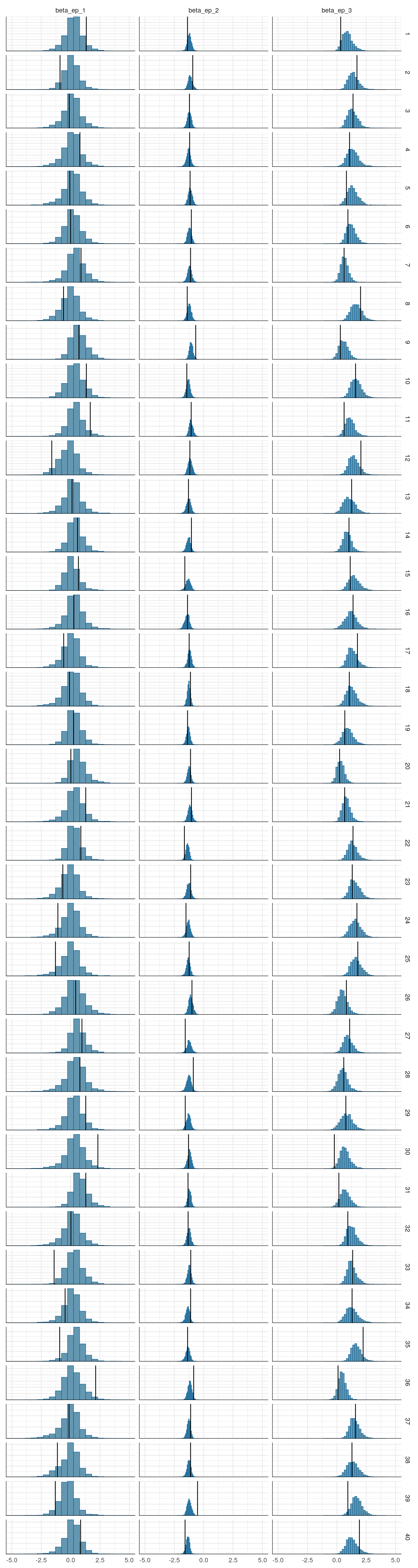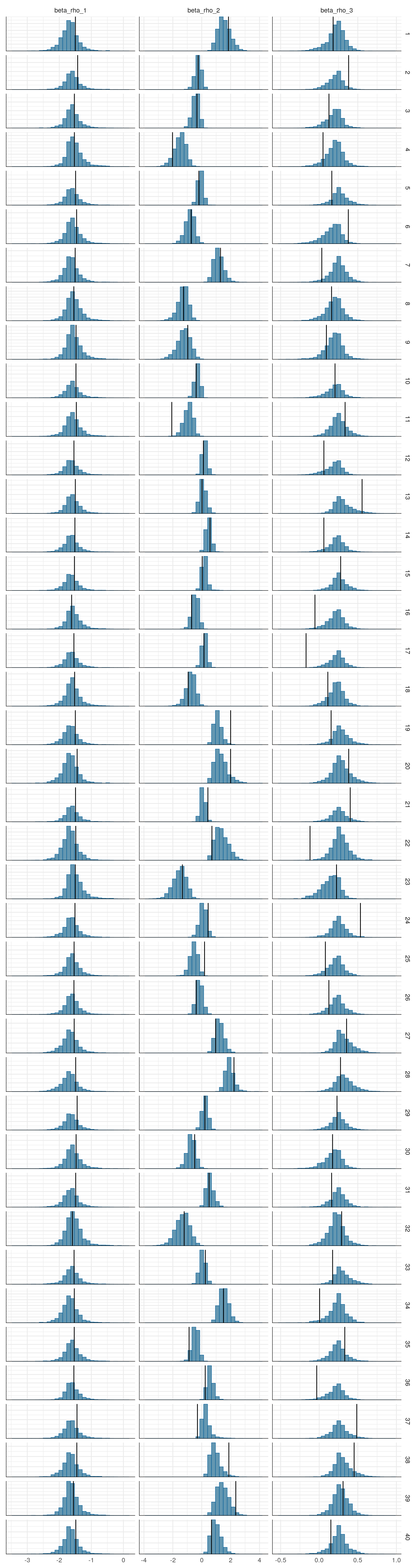 Figure 12: Priors, with \(epsilon\) and \(\xi\) on their transformed scales. Notice the very long tails for the individually varying \(rho\) parameters (beta_rho).